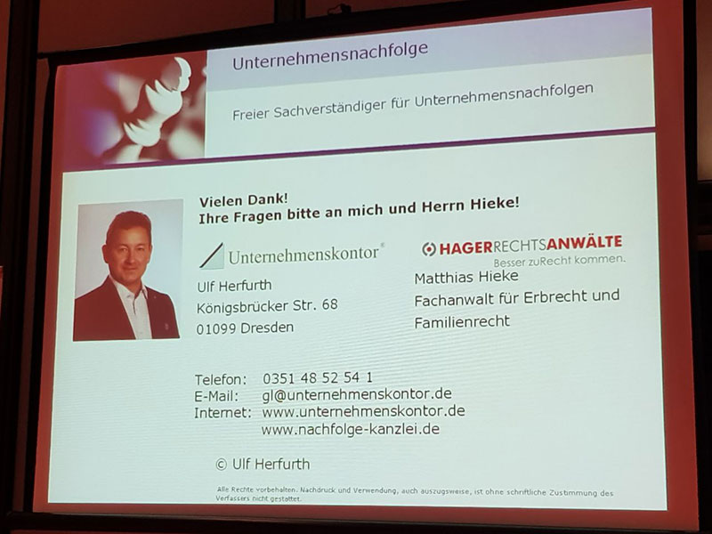 Unternehmer und Studenten konnten sich innerhalb unseres Vortrages und der anschliessenden Diskussion über den strukturierten Ablauf von Nachfolgen im KMU-Bereich und die dabei auftretenden und zu lösenden Problemfelder informieren. Der dabei zu lösende juristische Teil wurde von Herr RA Volker Reinhardt, Erfurt, vorgestellt.